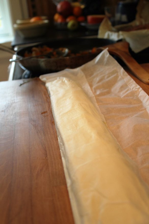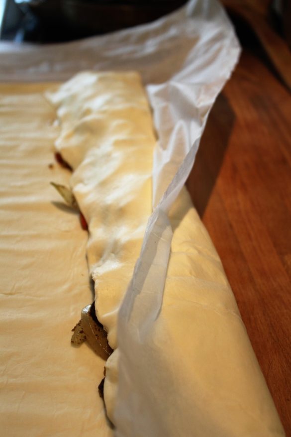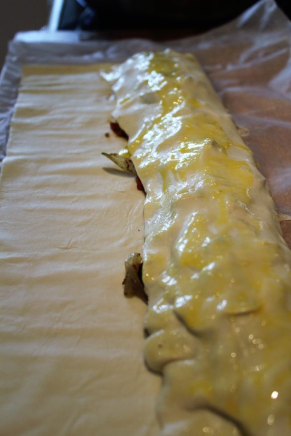 Læg fyldet på midten af butterdejsrulle, læg den ene side ovenpå –vær forsigtig, du kan bruge papiret til at rulle op så du ikke ødelægger dejen. Brug pisket æg til at samle siderne. Samle den sidste side, pensl igen med æg, så den bliver flot gyldne – bag i ovnen ved 200grader i 20-25 min eller indtil den bliver flot gyldne.