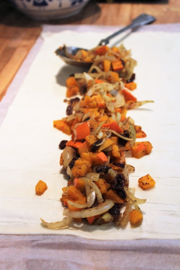 I stedet for æbler har jeg derfor brugt græskar og løg. Jeg har bibeholdt kanel og rosiner fra den klassiske apple strudel.