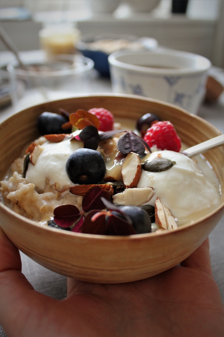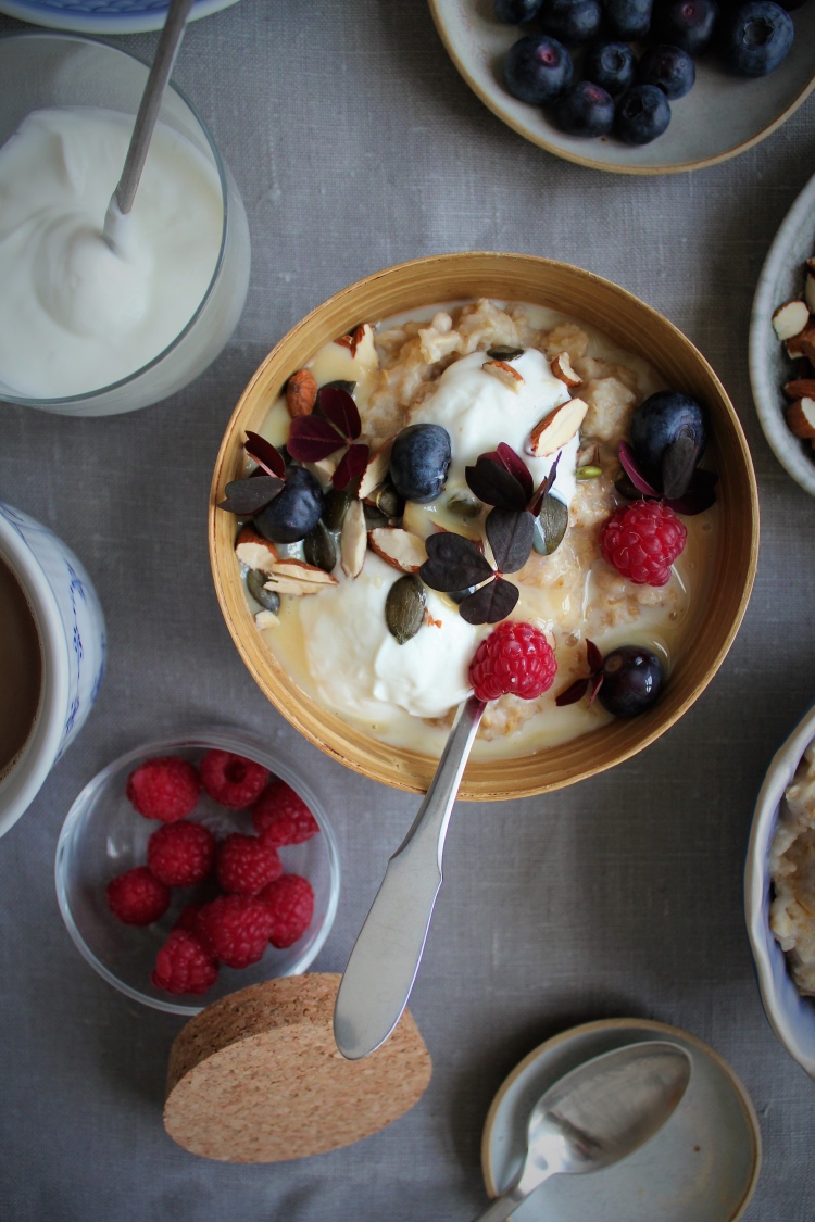 Hjemmelavet grød med skyr, friske bær & karamelcreme