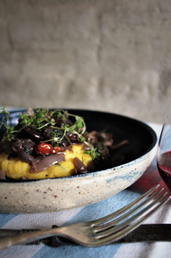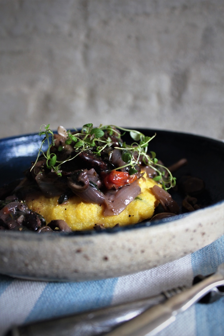 ♥Server retten med en god skefuld polenta toppet med svamperagout