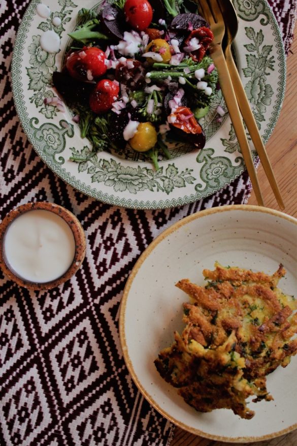 Men indtil da, kalder jeg dem bøffer. Spaghetti bøfferne får en vild lækker sprød overflade når de bliver stegt. Jeg har smagt dem til med hvidløg og frisk persille, men brug det du lige har i køleskabet. I salaten har jeg brugt aspagers broccoli, som er en krydsning mellem pak choi og broccoli. Grøntsagen har en dejlig smag af aspagers og broccoli (surprise), hvis du ikke lige kan skaffe asparges broccoli så brug enten asparges eller broccoli.